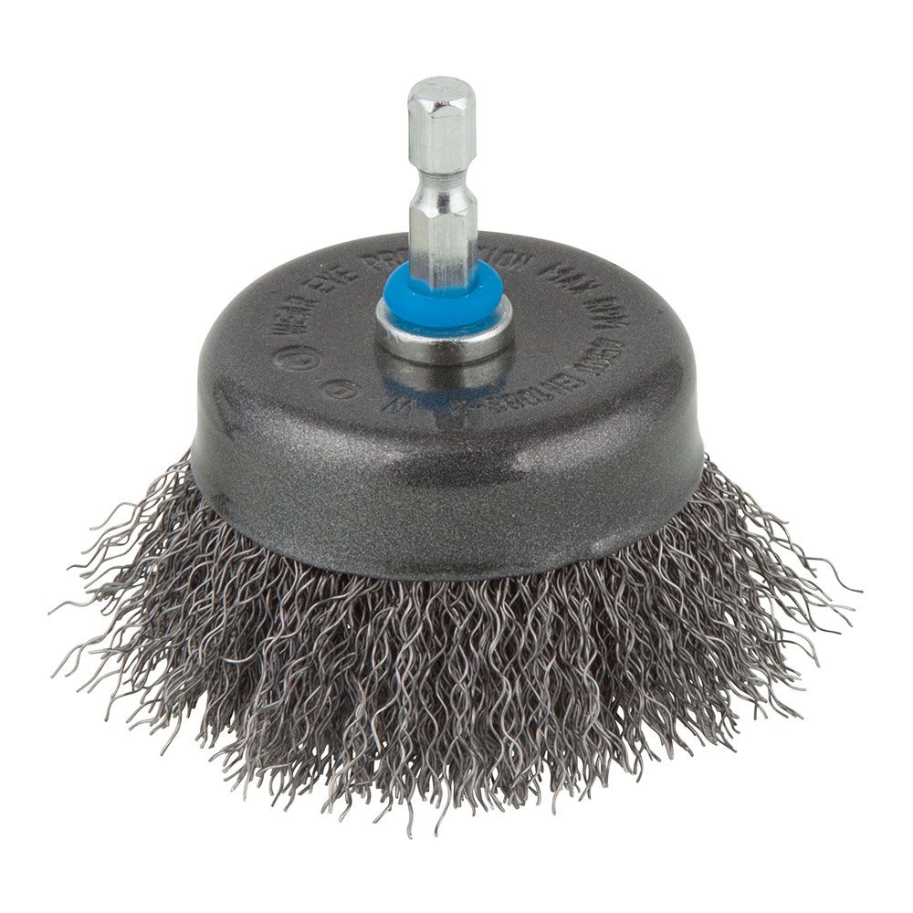 Cepillo de copa de alambre de acero diámetro de trabajo: ø75 mm longitud del alambre: 25 mm versión de vástago: vástago hexagonal de 6,35 mm, 1/4 pulg dimensiones: 75 x 75 x 65mm
