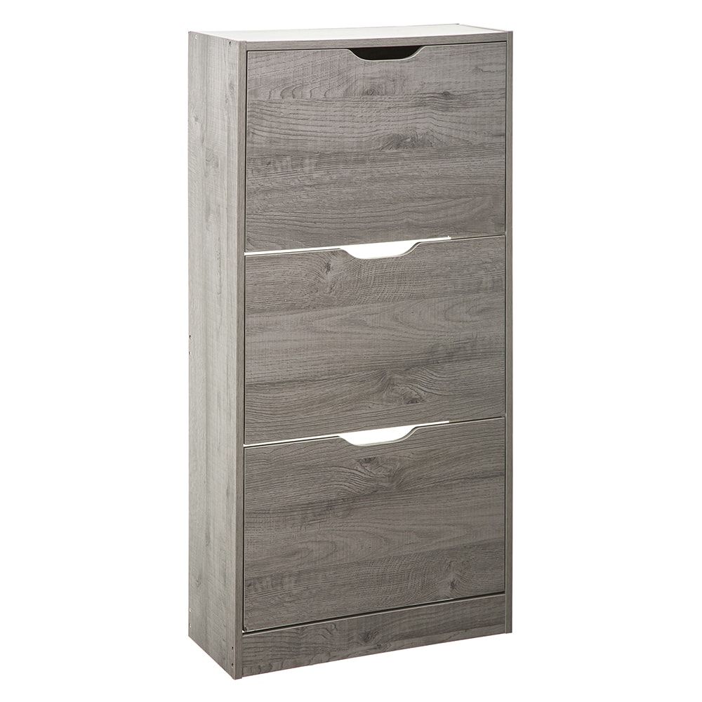 Zapatero de madera 115x60x24cm color gris. 3 compartimentos para 18 pares de zapatos
